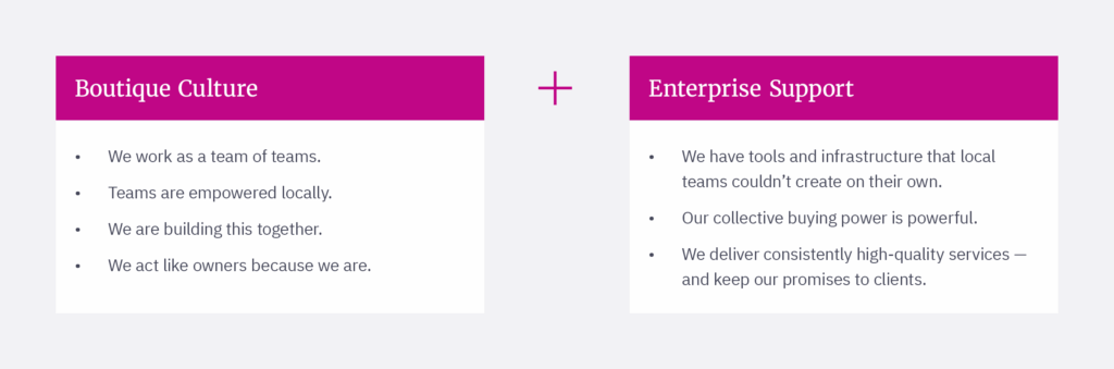 Boutique firms are known for great service and culture. Large firms typically have more resources. By integrating the best of both, we enable local teams to scale.